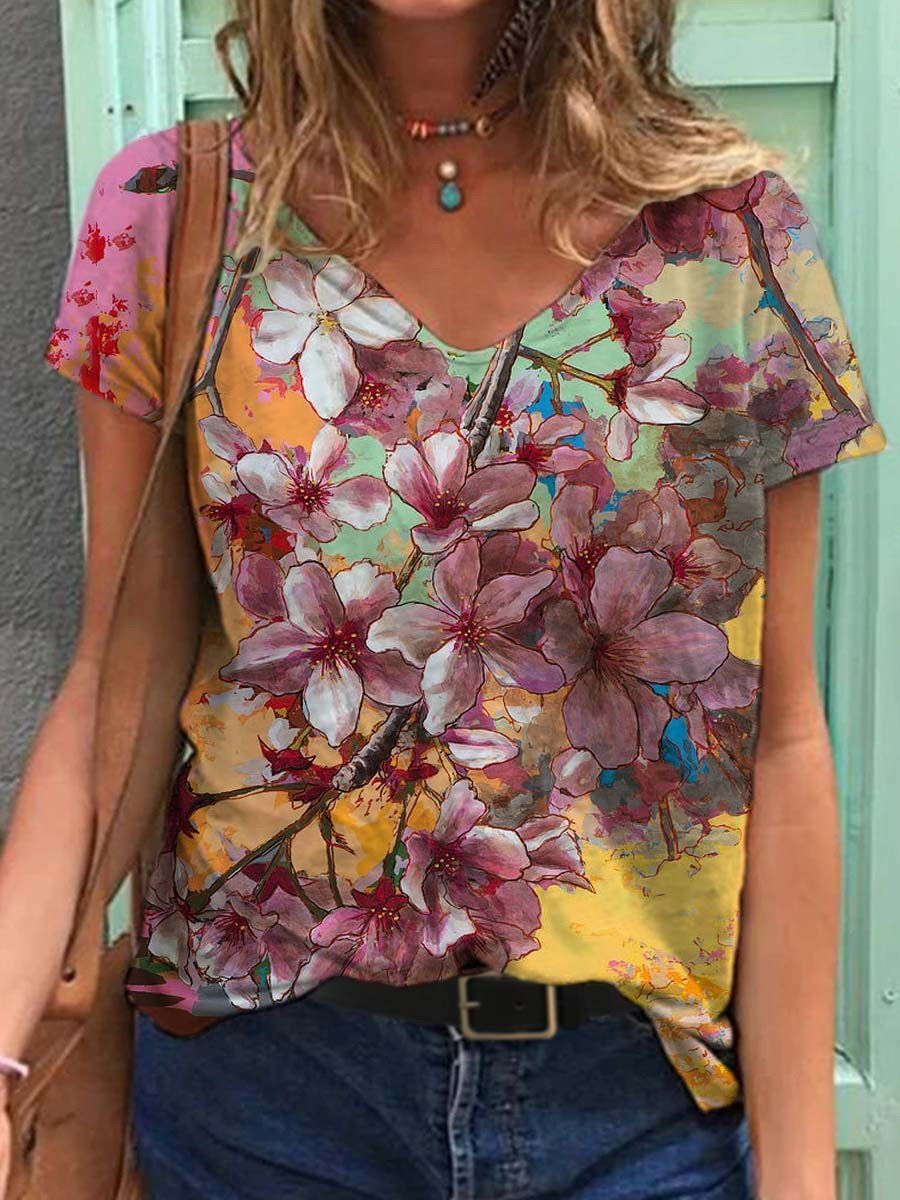 Short Sleeve Floral-Print Cotton-Blend Casual T-Shirts – Noracora