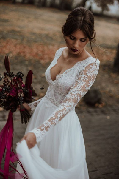 White Lace Appliqued A-Line Bridal Dresses Long Sleeve 2019 Summer Beach Sexy Wedding Dress Plus Size Backless Floor Length