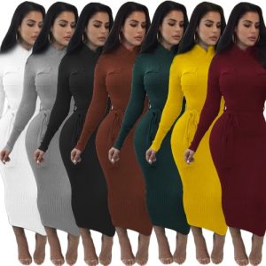 Women Autumn Winter Sweater Knitted Dress Belted Waist Slim Elastic Turtleneck Long Sleeve Bodycon Dress