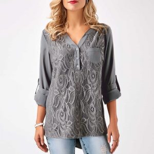 Women Chiffon Lace Shirt Blouse V Neck Roll-up Long Sleeves Buttoned Back Pocket Asymmetrical Casual Tunic Tops