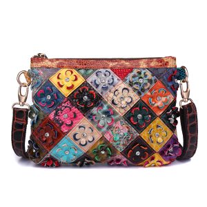 Women Genuine Leather Flower Decorational Patchwork Bag