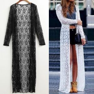 Women Floral Lace Kimono Semi Sheer Plus Size Solid Open Front Long Elegant Beach Cover Up Cardigan