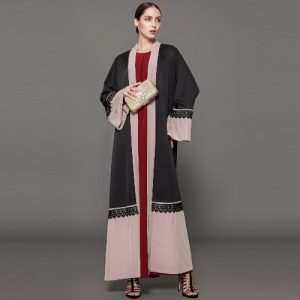Women Lace Robe Muslim Cardigan Turkish Abaya Long Sleeve Dubai Islamic Maxi Dress with Belt Black