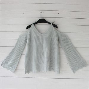 Women Knitted Sweater V Neck Cold Shoulder Flare Sleeve Spaghetti Straps Loose Casual Streetwear