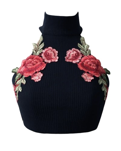 Women Sexy Crop Top Backless Camis Halter Embroidery Nightclub Party Short Tank Top Black/White