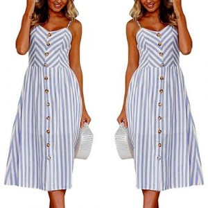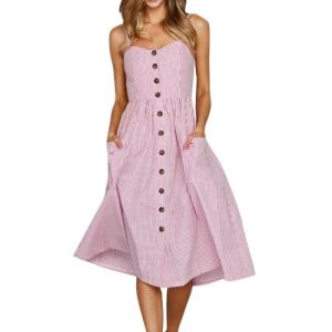 Women Skater Dress Spaghetti Straps Sleeveless High Waist Buttons Pockets A-Line Cami Midi Dress