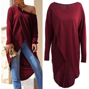 Women Tops Loose One Shoulder Round Neck Asymmetric Cross Over Dipped Longer Back Irregular Long Sleeve T-Shirt