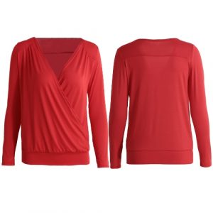 Women T-Shirt V-Neck Long Sleeves Autumn Top Cross Solid Slim Casual Tee Top Beige/Red/Black