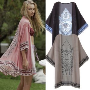 Women Summer Long Chiffon Cardigan Kimono Positioning Printing Beach Cover Up Bikini Outwear Khaki/Black/Pink