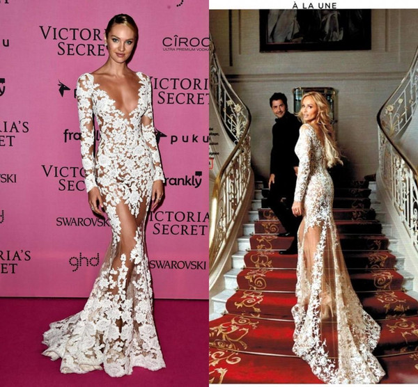 Zuhair Murad 2019 Sheer Lace Evening Dress Long Sleeve Red Carpet V-Neck Appliques Long Wears Illusion Prom Fashion Celebrity Party Gown