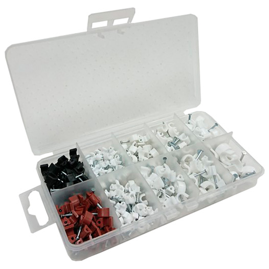 Assortment of Round Cable Clips in a 10 Compartment Carry Case.