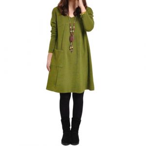 Autumn Winter Women Dress Plus Size Long Sleeves Pockets Solid V Neck Loose Dress