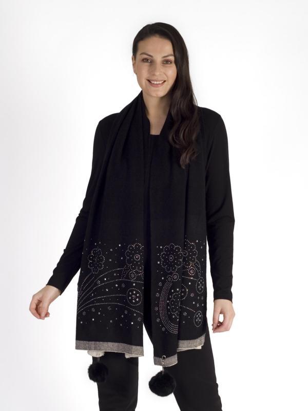 Black Diamond Design Scarf with Pom Poms