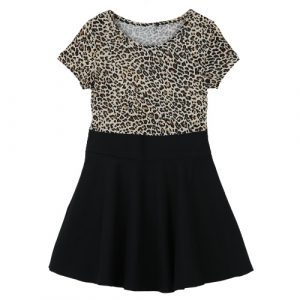 Fashion Cute Kids Girl Dress Leopard Print Round Neck Short Sleeves Mini Pleated Dress Black