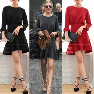 Fashion Women Flare Dress Round Neck 3/4 Sleeve Back Zipper Solid Color Mini Dress Red/Black/Grey