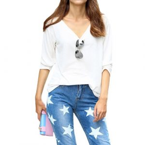 Fashion Women Girl T-Shirt V-Neck Long Sleeve Solid Color Pullover Casual Loose Tops Tee Blouse Black/White