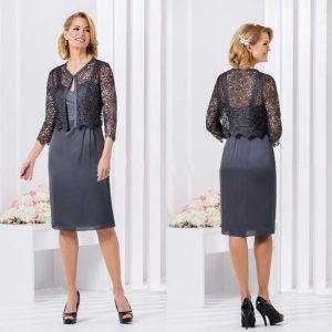 Grey Two Pieces Mother Of The Bride Dresses With Jackets Plus Size Elegant Knee Length Lace Madre De Los Vestidos De Novia
