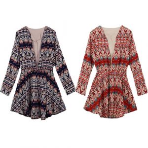 New Fashion Women Casual Patchwork Dress Ethnic Print Long Sleeve Button Ruffle Elastic Waist Red/Dark Blue