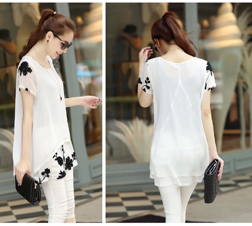 New Fashion Women Chiffon Blouse Embroidery Crew Neck Short Sleeve Loose Fit Casual Tops White/Black