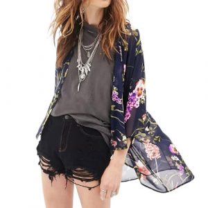 New Fashion Women Chiffon Cardigan Open Front Floral Print Half Sleeve Kimono Black