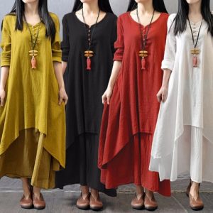 New Fashion Women Casual Loose Dress Solid Long Sleeve Cotton Linen Boho Long Maxi Dress