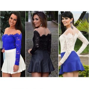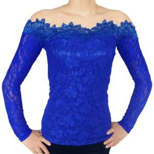 New Fashion Women Sexy Blouse Mesh Shoulder Long Sleeves Floral Lace Basic Shirt Tops Blue
