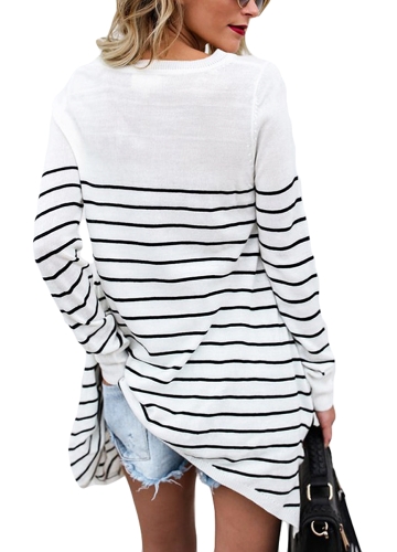 New Fashion Women Striped T-Shirt O Neck Long Sleeves Asymmetric Long Tee Shirt Black/White