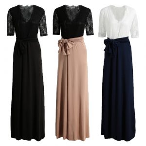 New Fashion Women Maxi Dress Lace Splice Thigh Split V Neck Half Sleeve Belt Slim Elegant Long Dress Black/Pink/Dark Blue