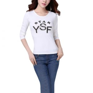 New Korean Women T-Shirt Letter Print Beading Crew Neck Long Sleeve Slim Casual Tops White