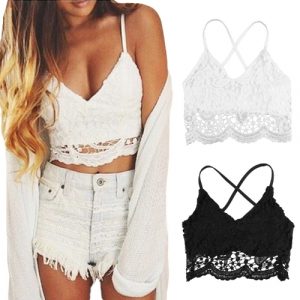 New Sexy Women Crop Top Crochet Lace Deep V Neck Spaghetti Strap Backless Tank Camisole Bralette Black/White