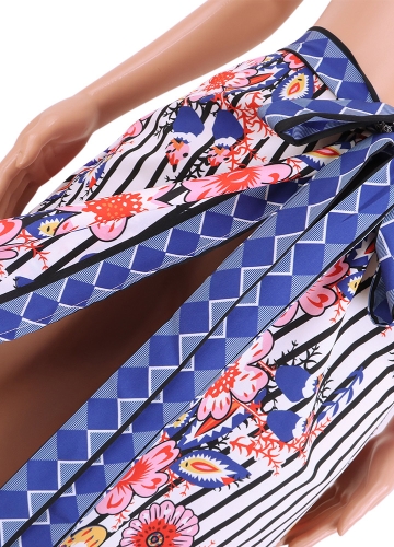 New Sexy Women Floral Skirt Open Front Side Tie High Waist Asymmetric Beach Skirt Blue