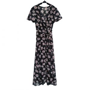 New Sexy Women Chiffon Maxi Dress Floral Print Deep V Split Short Sleeve Slim Beach Holiday Long Dress Black