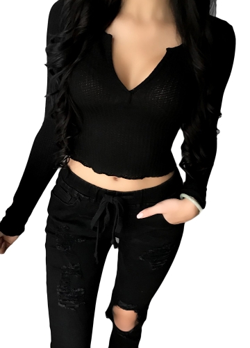 New Sexy Women Crop Top Deep V Long Sleeves Solid Color Cropped Top Tees Pullovers T-shirt