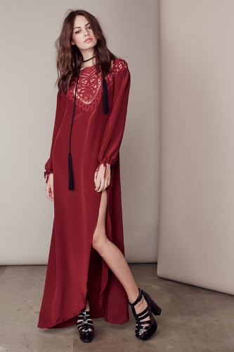 New Sexy Women Maxi Dress Lace Open Back Thigh Split Round Neck Long Sleeve Long Dress Black/Burgundy
