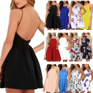 New Sexy Women Mini Slip Dress Backless Spaghetti Strap Solid Floral Slim Ruched Party Skater Dress