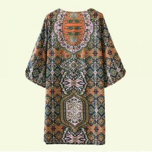 New Women Mini Dress Vintage Floral Print Cut Out O-neck Half Sleeves Elegant Loose Straight Dress Green