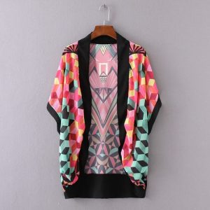 New Women Loose Outerwear Open Front Geometric Print Short Sleeves Thin Vintage Casual Cardigan Coat Red