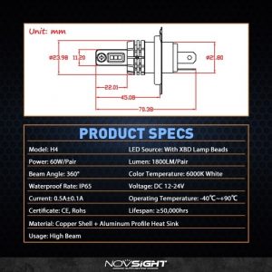 NOVSIGHT H4 60W 1800lm Car Led Headlights Fog Lights Copper Heat Conduction 6000K White Fog Lamps Bulbs