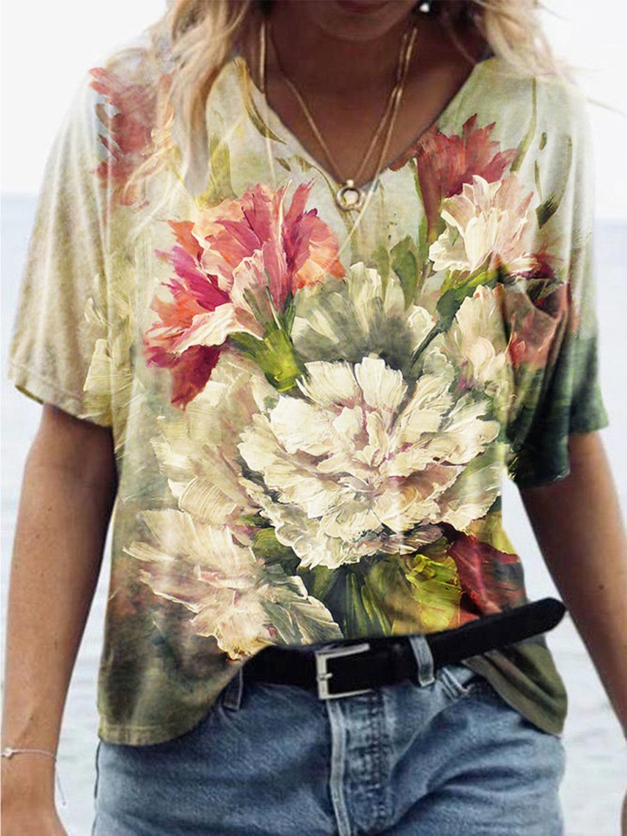 Color Short Sleeve Floral Cotton-Blend Crew Neck T-Shirts – Noracora