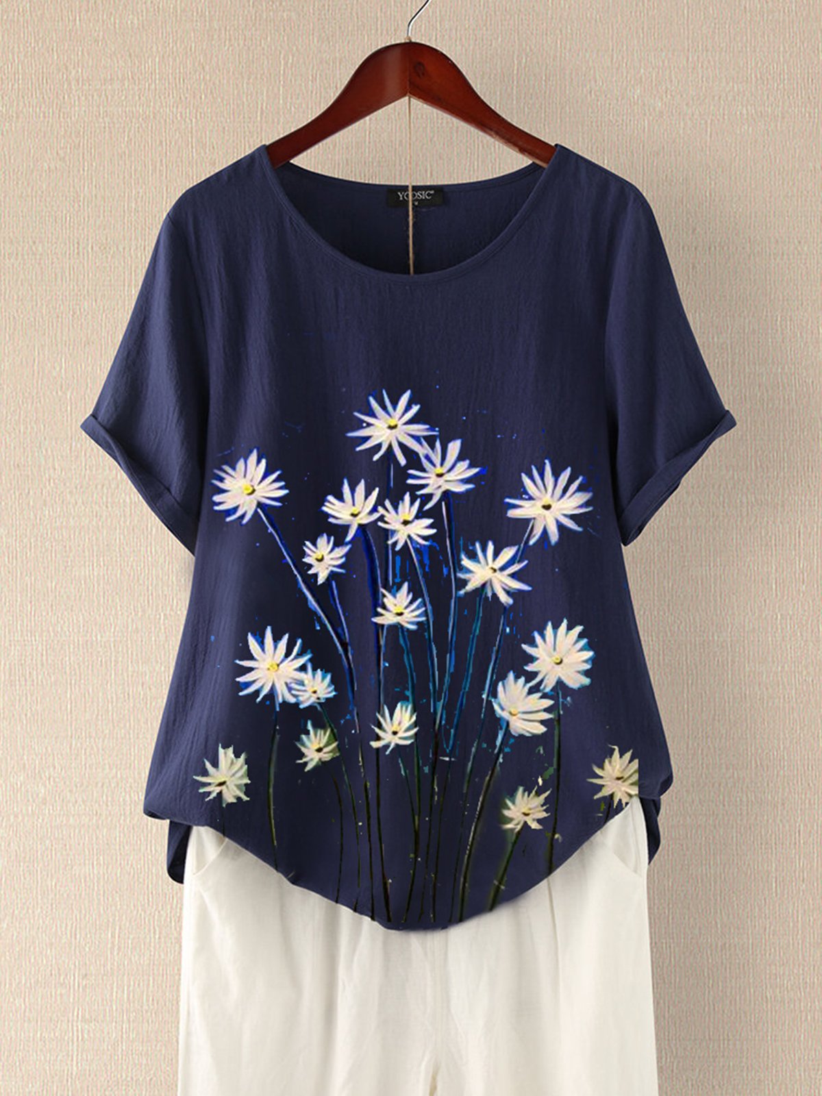 Dark Blue Floral Short Sleeve Cotton-Blend T-Shirts – Noracora