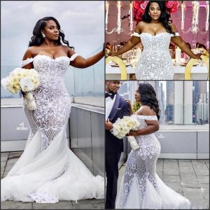 Modest Sexy Mermaid Wedding Dresses Lace Applique Trumpet Bridal Gowns Off Shoulder Beach Plus Size Wedding Dress