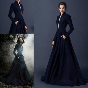 Navy Blue Satin Evening Dresses Embroidery Paolo Sebastian Dresses Custom Made Beaded Formal prom Wear outfit Plunging V Neck Ball Gowns