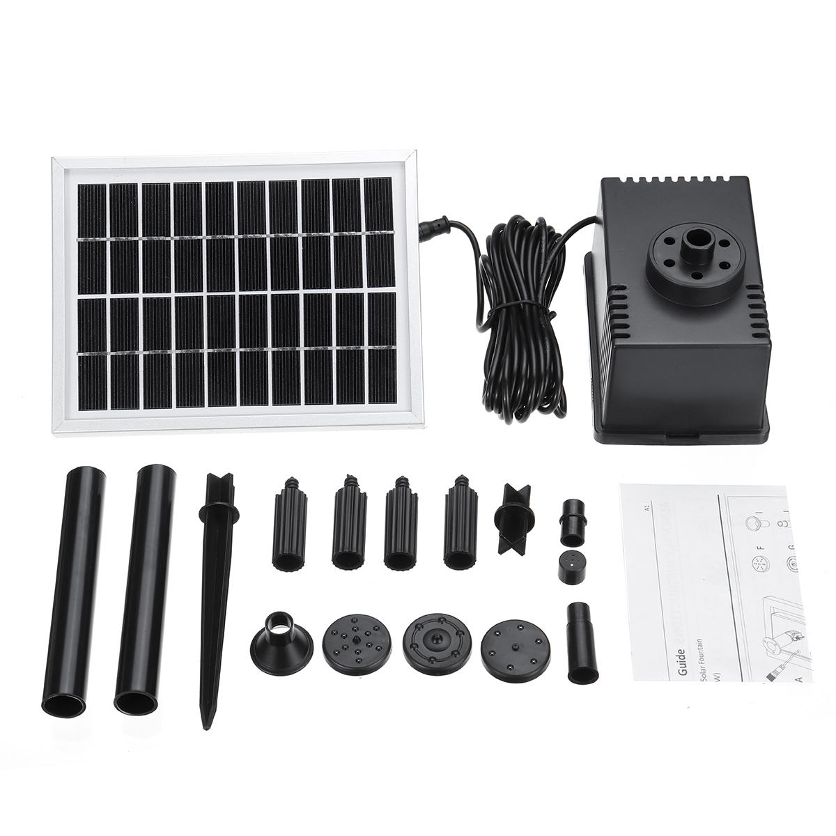 Feature:1. Solar-powered fountain automatically switches on when exposed to sunshine, Eco-friendly and money-saving.2. Come up with sponge filter, effectively avoiding blockingmosquito/insect breeding.3. The pump regularly renews the pond with fresh oxygenated water thus to help fish grow.4. Highly efficient solar panel and new brushless pump, easy to assemble, cleandurable.5. Aerate the pool to increase the pH of waterkeep water circulating to improve underwater environment.6. Suitable for bird bath, fish tank, small pond, garden decoration, water circulation for oxygen, etc.Specification:Item TypeSolar Fountain PumpMaterialMonocrystalline SiliconColorBlackSolar Panel10V/2WPump PowerDC9V/1.5WMaximum Flow180L/HFountain Height30-60CM/ 11.81-23.62Pump Cable Length3M/ 118.11Pump sizeApprox.12×7.9x13cm/ 4.7×3.11×5.12Solar panel sizeApprox. 17x13x0.9cm/ 6.69×5.11×0.35Delay5sSpeed5000 (rpm)Suction caliber8 (mm)Discharge port diameter8 (mm)Efficiency0.2Note:1. The water pump will not work without sunlight; it will restart within three seconds once the sunlight re-appears.2. Change water frequently to keep the water clean to avoid any dirt impeding the pump;3. DO NOT put the solar panel and control into water;4. Keep the surface of solar panel clean constantly;5. The height of fountain depends on the sunshine intensity.Package Included:1 x Solar Panel4 x Nozzles1 x Nozzle Base1 x Connection Head1 x Outlet1 x Pump With Filter2 x Tube1 x The intubation1 x Operation Guide