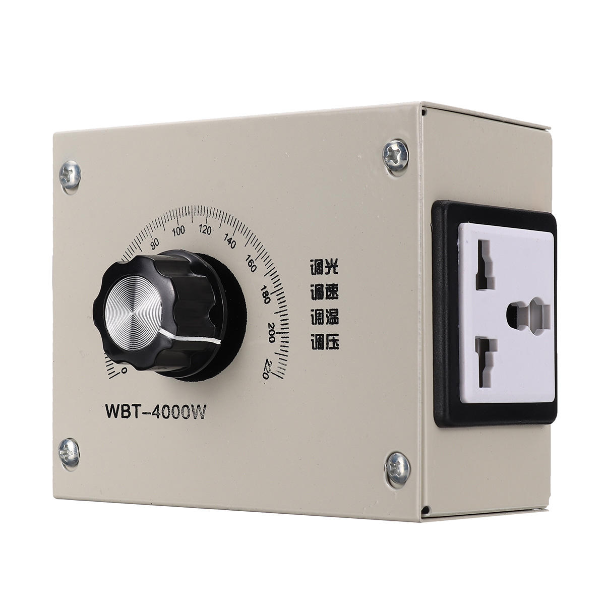 Specifications:- Color: Ivory white- Input voltage: AC 220V10%- Output voltage: AC 0-220V10%- Control motor power: 0-4000W- Efficiency (): 95%- Size: Approx.105x55x85mm/4.21×2.20×3.31Features:- AC 0V-220V continuously adjustable, zero hysteresis, zero latency, superior heat dissipation.- Can be used in many places, such as electric furnace, incandescent lamp, baking lamp, PTC heating plate, electric iron, electric blanket, axial fan etc..Used for:1. Fan speed control2. Electric furnace water heater temperature control3. AC motor speed control4. Adjust the brightness of the lightsPackaged included:1 x Variable Voltage ControllerMore details: