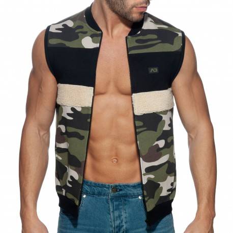 Sporty sleeveless vest in camouflage style. Warm lining made from fleece-like fabric. Horizontal sheepskin stripe on the torso. Full zipper. 2 side pockets. AD silicone logo on the right chest.