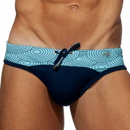 Low-rise swim brief made from resistant and comfortable microfiber. Original concentric print on the top part. Removable Pack Up foam system to enhance your manhood. Elastic waistband with drawstring. AD silicone logo on the left hip.