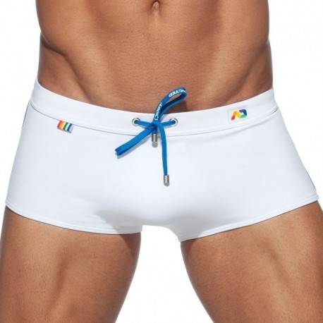Low-rise swim boxer. Sexy and fitted cut. Removable Pack Up foam system to enhance your masculinity. Rainbow back pocket. Contrast side piping. Elastic waistband with drawstring. Rainbow Addicted logo and label. Made in Barcelona.