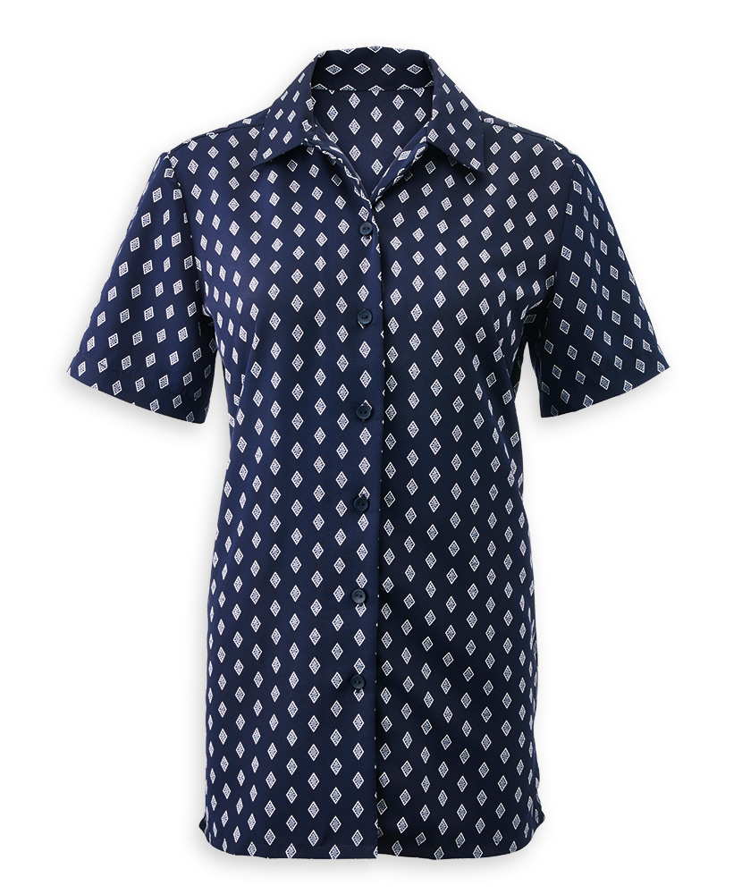 Open convertible collarFront button fasteningShort sleevesSide vents130gsm 100% polyesterUp to 50 washSizes 8 – 26Back length: 75 – 79cm (increases with size)For regular length option see NF60