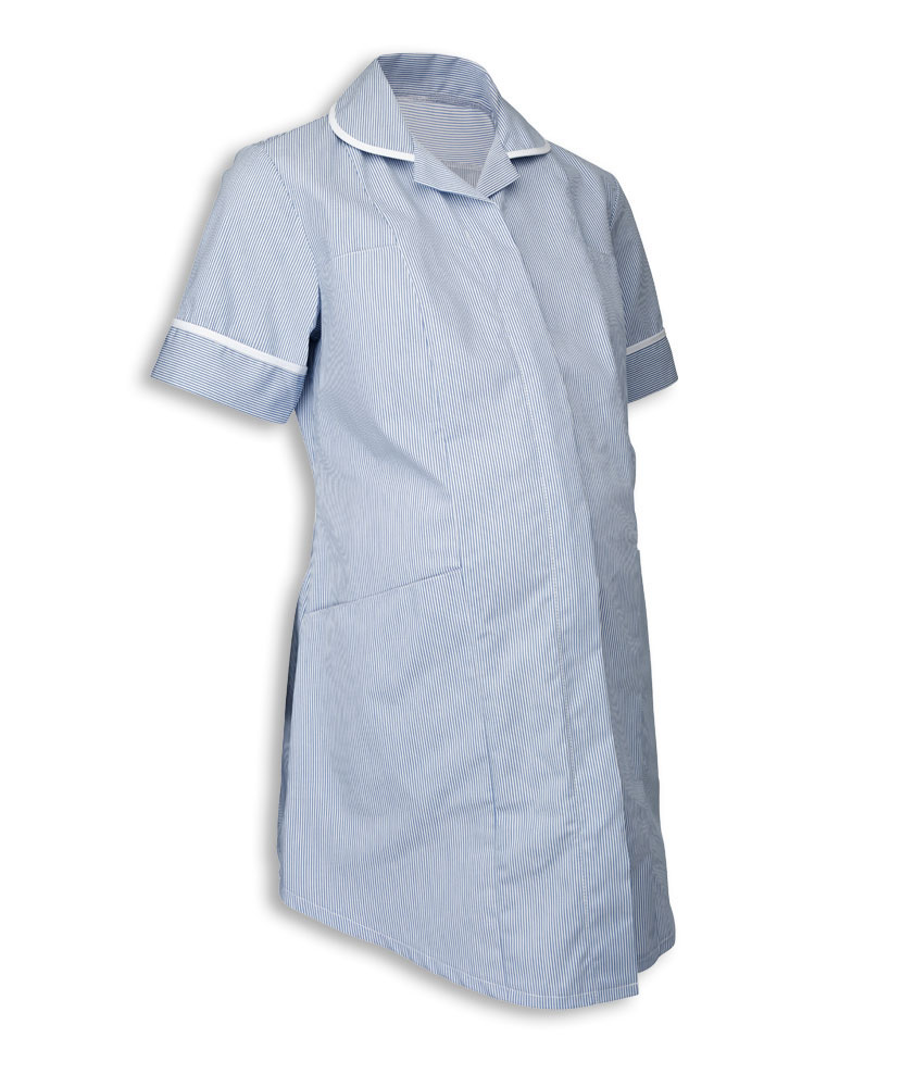 Woven stripe fabric with concealed zip frontTwo hip and chest pocketsDouble action back and vents195gsm 67% polyester/33% cottonMachine washable and industrially launderableCentre back length: 75 – 81cm (increases with size)