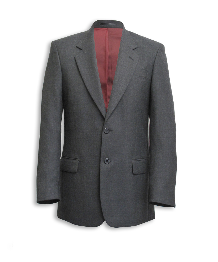 Charcoal two button single breasted jacket with chest welt pocketBurgundy 100% Polyester liningTwo side pockets with flapsFour internal pockets.55% Polyester/ 45% WoolDry clean onlyTwin back ventsSize Chart A